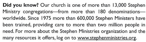 Would you like to know more about Stephen Ministries? Do you know someone who needs someone in their life that will walk through a crisis in their life? Call the Pastor for more information about Stephen Ministries. Call the church at 256-734-0340 and ask to speak to the Sr. Pastor.